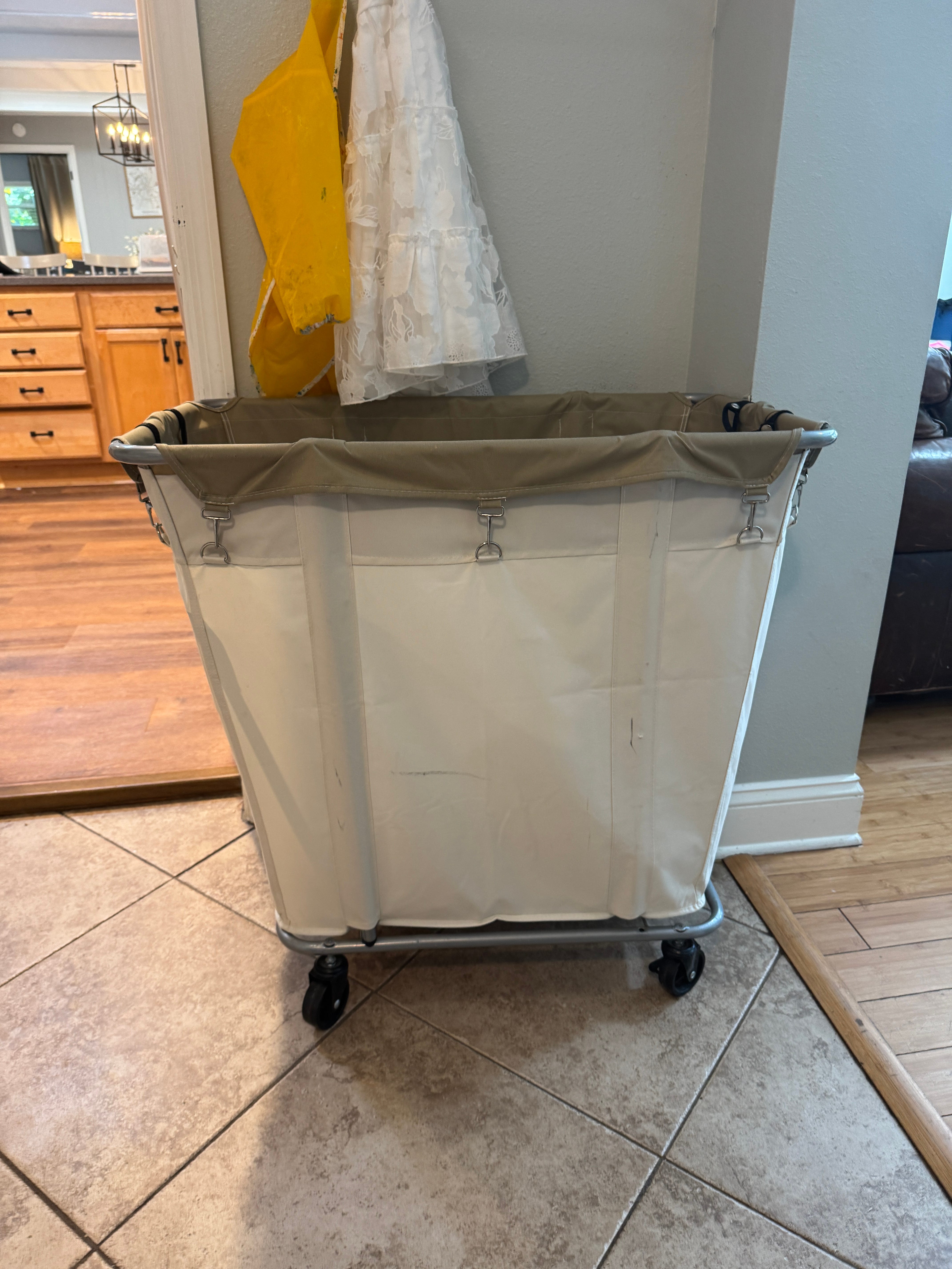 Washing daily is easier for me than washing a week’s worth of laundry at once but folding and putting away is a different story. Washing, folding and putting away one small load would be so boring and laborious for me. Instead, I move the dry clothes from the dryer in to my huge laundry cart. It’s big enough to hold a week’s worth of laundry for my family of 5. By the time it’s overflowing, it’s time for me to fold laundry which I do once a week while I watch a show. Here is my laundry cart.