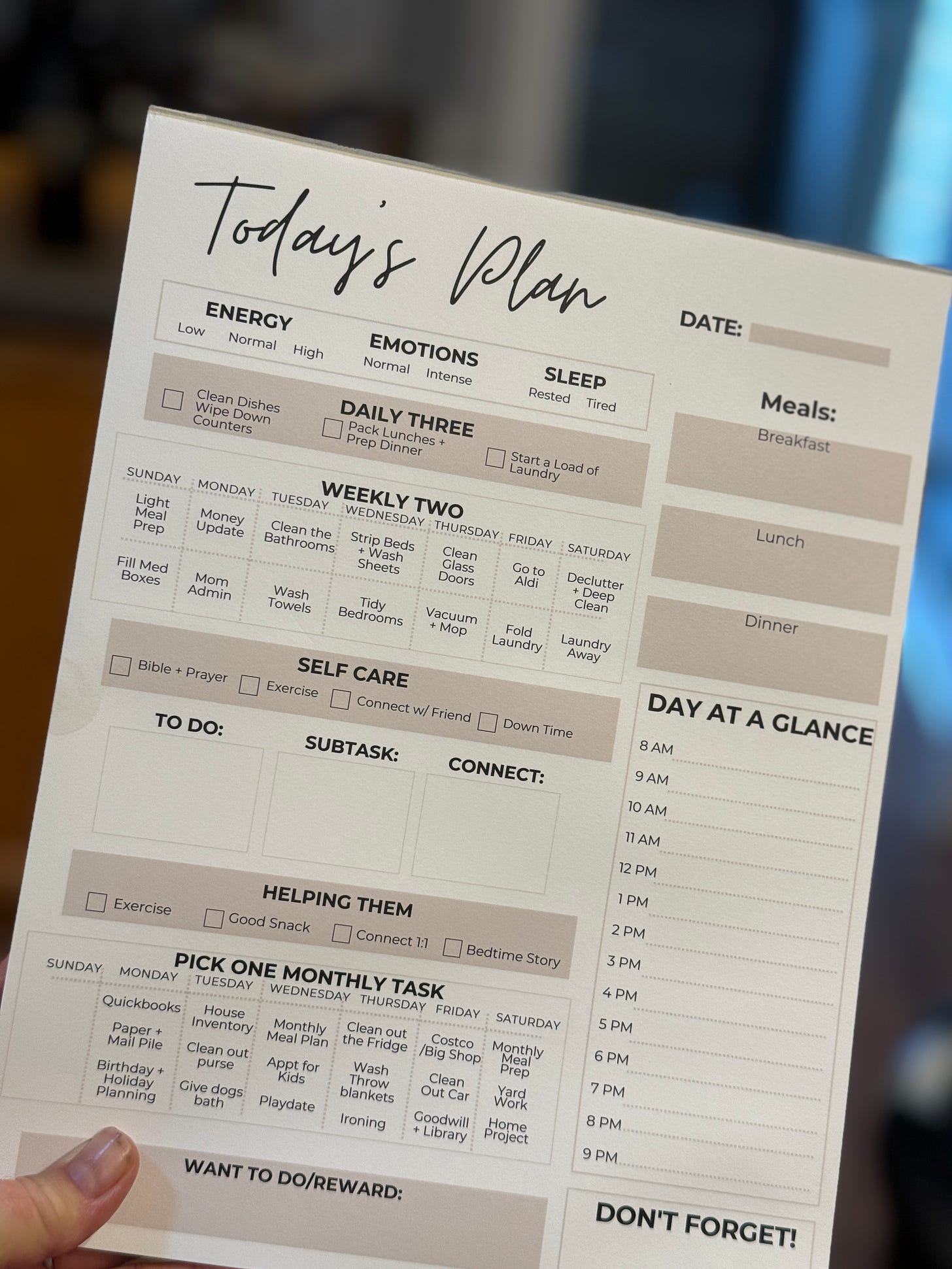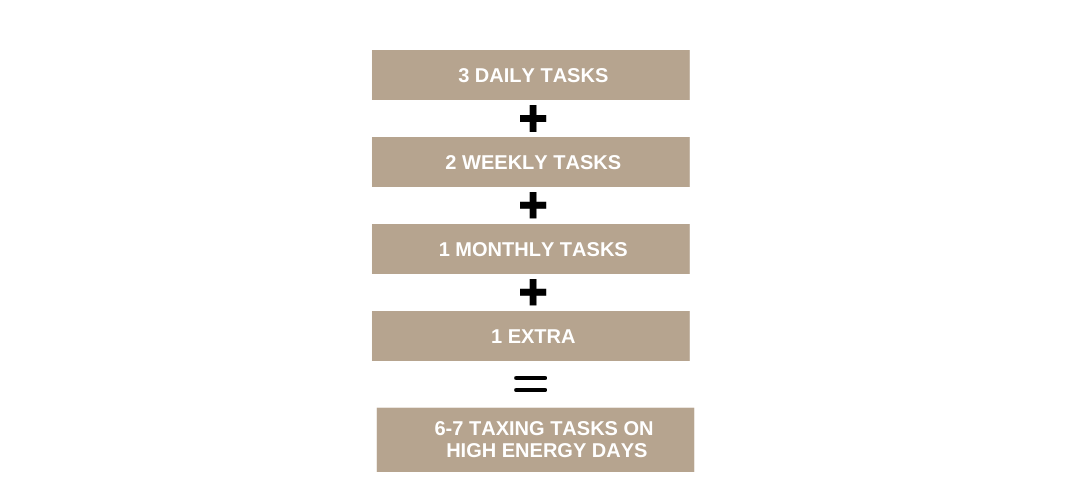 Once my daily energy became more consistent, and the 3 daily tasks became really manageable, I added 2 weekly tasks and 1 monthly task. The idea is that on normal energy days, I’d be able to accomplish 6-7 boring tasks. On low energy days, I still try and do my daily 3 and don’t worry about the weekly and monthly tasks.