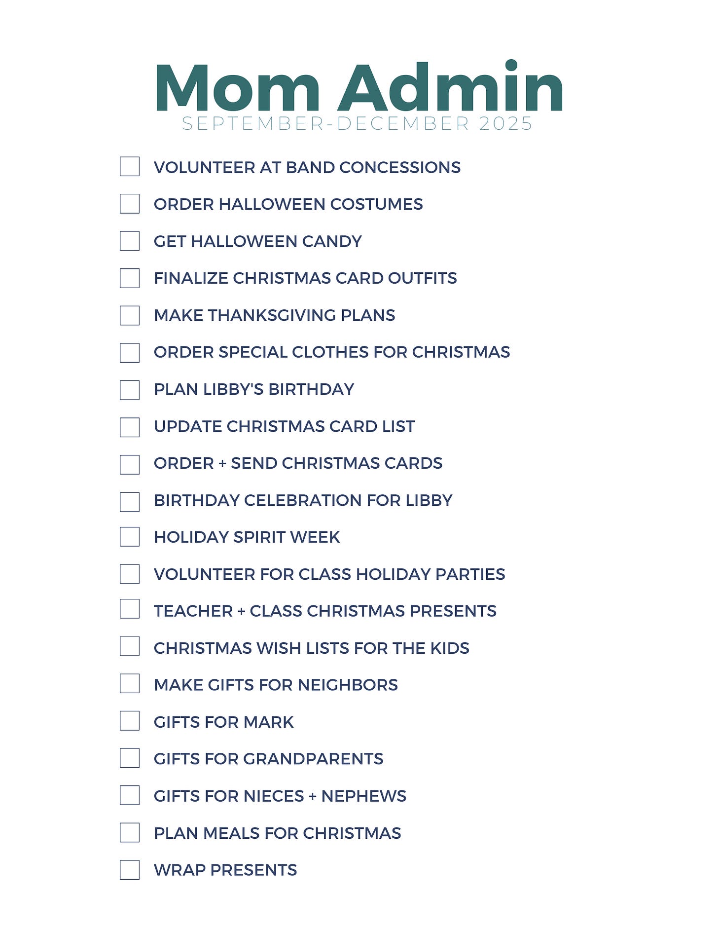 I have three different mom admin lists. I have a Spring list that January-April, a Summer list that is May-August and then a Fall list that is September-December. I try to limit each list to 20 tasks. Given that each season is 17 weeks, that works out to right around 1 “mom admin” task a week.